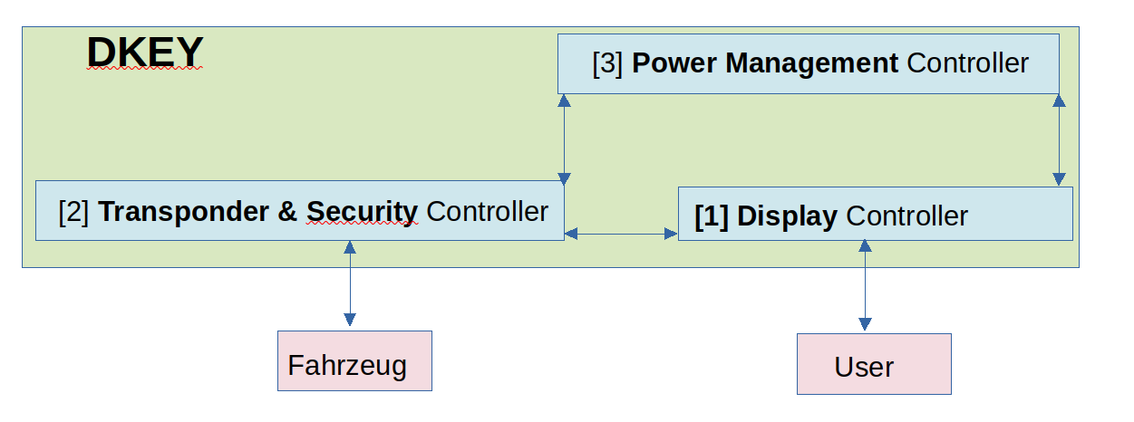 Bild 1 zeigt eine einfache Skizze der Hardware-Architektur des Steuergerätes, welche die Aufteilung der Aufgaben im Projekt erklärt. Jeder der (3) Rechtecken stellt einen (logischen) Controller dar. Die Pfeile verdeutlichen vorhandene (beidseitige) Datenflüsse. Das DKEY-Gerät steht in Verbindung: